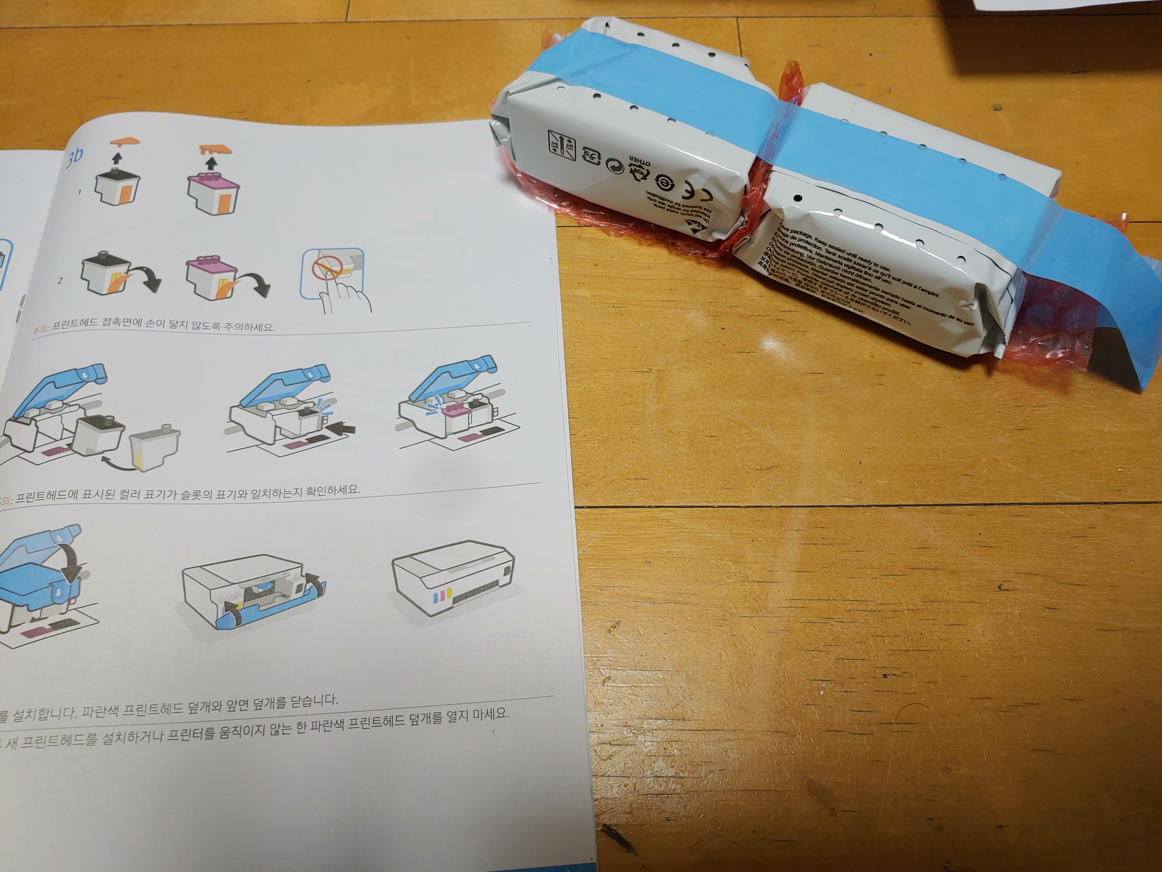 레이저 프린터와 달리 SL-T1675W 무한잉크 프린터는 토너 끼우듯 간단하지 않았다. 잉크도 따로 있고 프린터 헤드도 따로 있었다. 프린터 헤드는 포장 스티로폼에 붙어 있어 잘못하면 못 찾을뻔했다