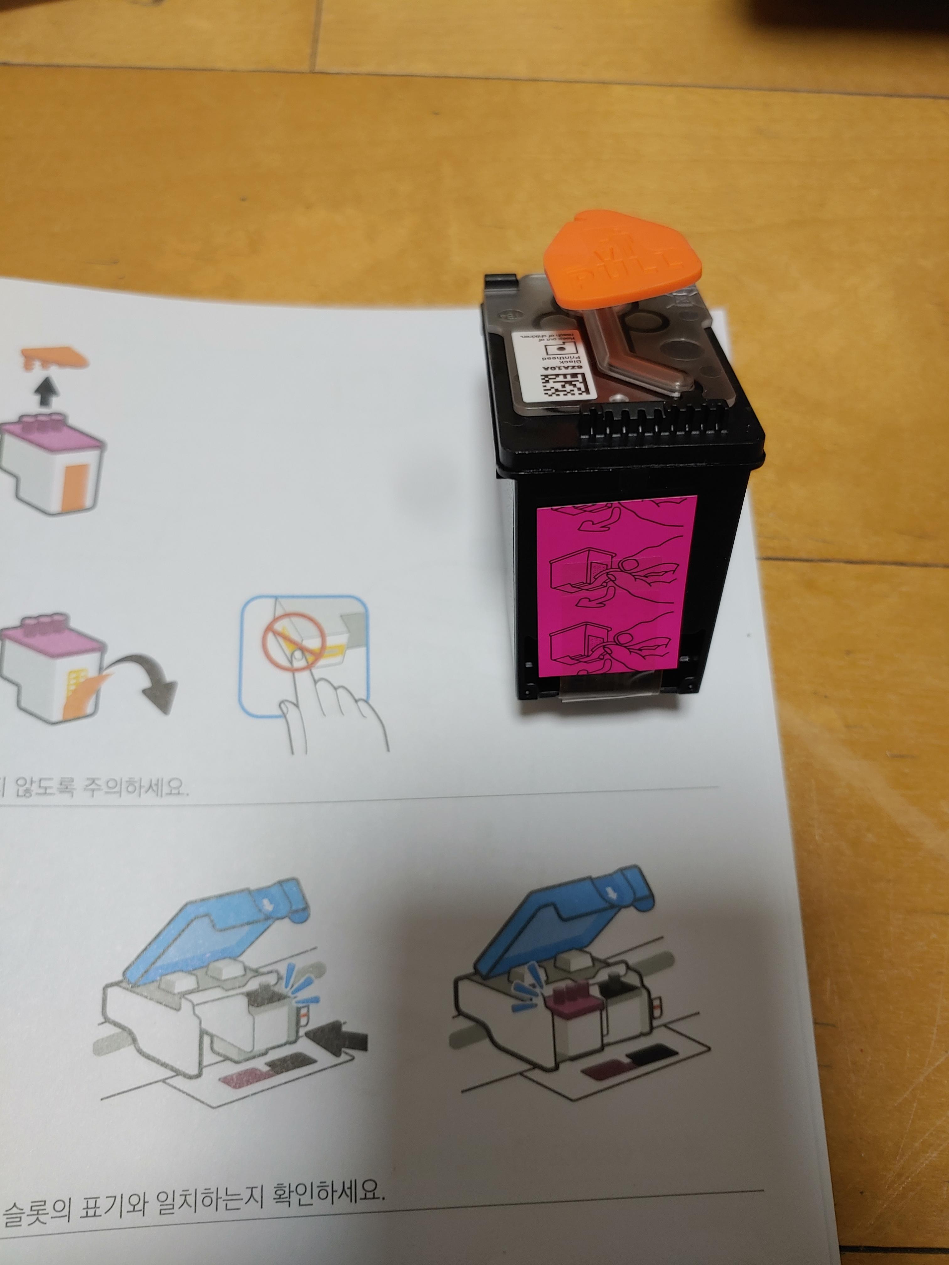 나머지 잉크들도 주입 완료한다. 이후 프린터 헤드 설치 위해 헤드 자리에 들어가 있던 주황색 플라스틱을 제거한다.